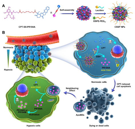 在本文中,作者首次提出邻近效应可以由凋亡小体介导,并对其具体机制进行了验证。此外,作者提出化疗药物的消耗和内部低氧肿瘤细胞的耐受性可能会限制邻近效应介导的肿瘤渗透的持久性。为了放大该效应,作者设计了共载有喜树碱和低氧激活前药PR104A的还原敏感型二聚体前药自组装纳米粒(该团队在肿瘤氧化还原响应型前药自组装递送系统已取得了一些进展,如Science Advances 2020, 6:eabc1725; Nature Communications 2019, 10:3211; Nano Letters 2018, 18:3643-3650; Nano Letters 2016, 16:5401-5408; Nano Letters 2014, 14:5577-5583; Small 2020, 16:e2005039; Small 2016, 12:6353-6362)。在常氧肿瘤细胞中,喜树碱具有较强的细胞毒性,PR104A毒性相对较低;而在低氧肿瘤细胞中,PR104A的细胞毒性被激活,喜树碱毒性降低。在喜树碱对肿瘤外周常氧肿瘤细胞杀伤后,凋亡细胞分割为凋亡小体包裹剩余的药物,通过邻近效应被内部低氧肿瘤细胞吞噬,PR104A杀死内部低氧肿瘤细胞从而进一步将药物递送至更深的肿瘤。该研究为通过凋亡小体介导的邻近效应实现深层肿瘤渗透提供了新的见解。在未来的研究中,这种策略可能会被用于提高纳米药物的治疗效率并促进其临床应用。