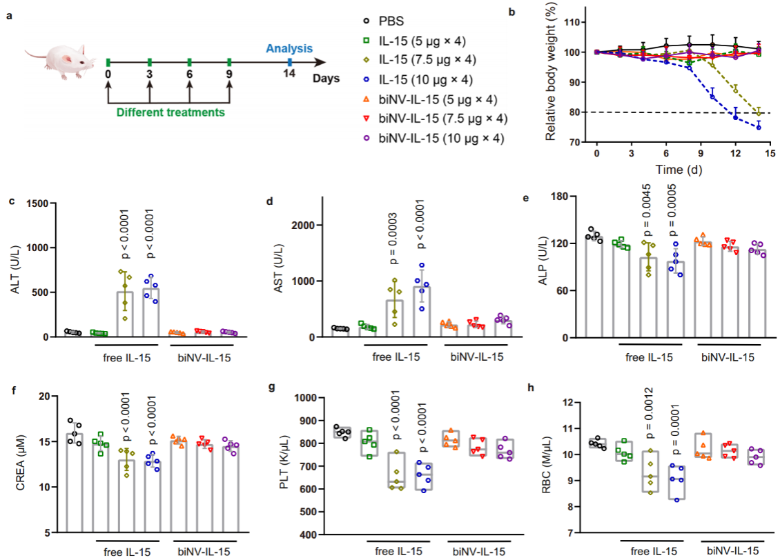接下来作者考察了biNV-IL-15的体内毒性。将IL-15和biNV-IL-15给予小鼠,在单次治疗剂量超过7.5 μg的情况下四次注射IL-15后观察到显著的体重减轻,最终引起致死的免疫毒性。相比之下,即使在最大可用注射剂量下,biNV-IL-15的治疗也没有出现明显的毒性(图4)。IL-15和肿瘤抗原的时空同步呈递阻止了非特异性全身免疫刺激,从而避免了系统毒副作用。