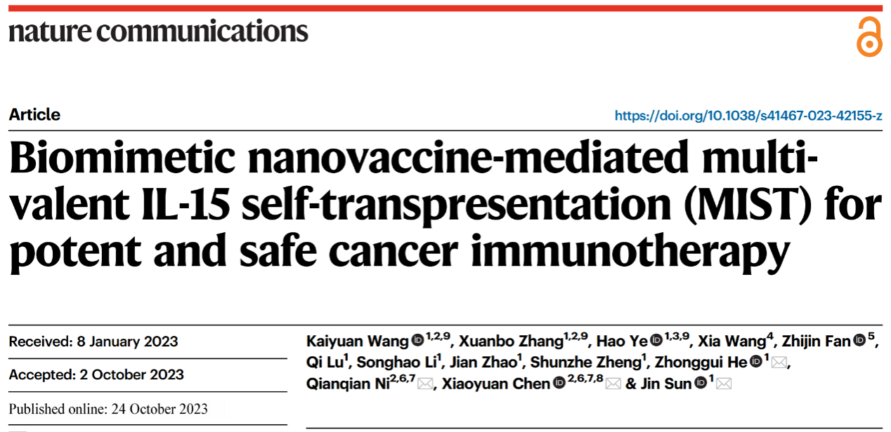 2023年10月24日,beat365在线体育官网登录入口孙进教授、何仲贵教授与新加坡国立大学陈小元教授、倪倩倩助理教授合作在Nature Communications杂志在线发表题为“Biomimetic nanovaccine-mediated multivalent IL-15 self-transpresentation (MIST) for potent and safe cancer immunotherapy”的研究论文,开发了仿生纳米疫苗介导多价IL-15自反式呈递,实现了IL-15和肿瘤抗原的时空同步递送,从而有效产生肿瘤特异性细胞毒性T淋巴细胞,用于有效且安全的肿瘤免疫治疗。