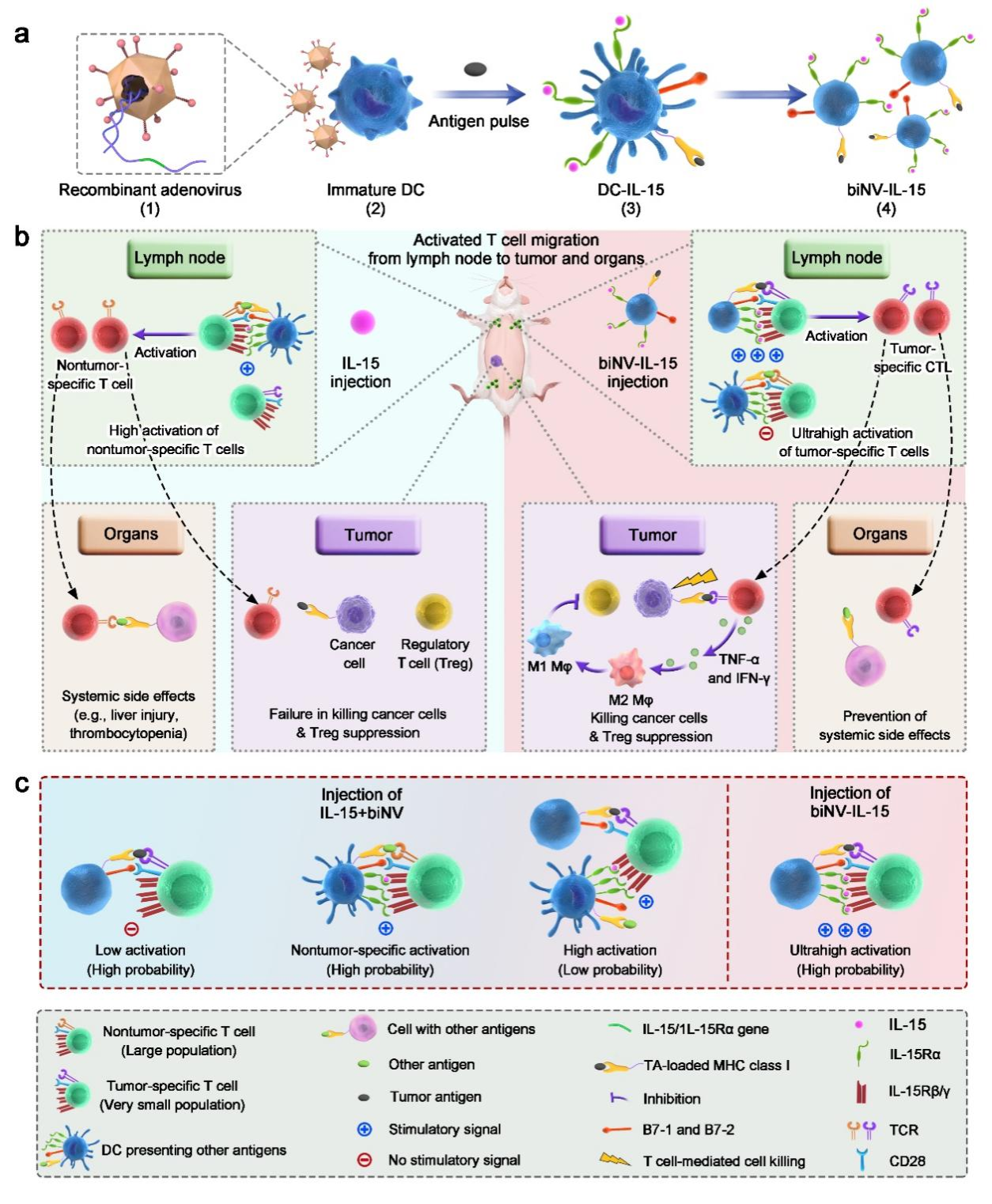 在这项工作中,作者通过工程化树突状细胞(DC)衍生的细胞膜囊泡设计了仿生纳米疫苗,以实现时空同步的细胞因子递送(biNV-IL-15)。该仿生纳米疫苗具有多价IL-15自反式呈递、通过主要组织相容性复合体(MHC)分子定向呈递肿瘤抗原表位以及共刺激分子锚定的特性。其具有纳米级结构,可有效延长体内循环半衰期和在淋巴器官中的滞留,改善治疗窗。与需要与APC上的IL-15Rα结合的传统IL-15疗法相比,仿生纳米疫苗可以以多价方式直接介导IL-15反式呈递给CD8+T细胞,从而引发强大的T细胞激活,其被定义为“多价IL-15自反式呈递”。biNV-IL-15的系统给药可将IL-15靶向递送至肿瘤特异性T细胞,减少非特异性全身免疫刺激,并最大限度地激活细胞毒性T淋巴细胞(CTL)以驱动肿瘤杀伤和免疫记忆。