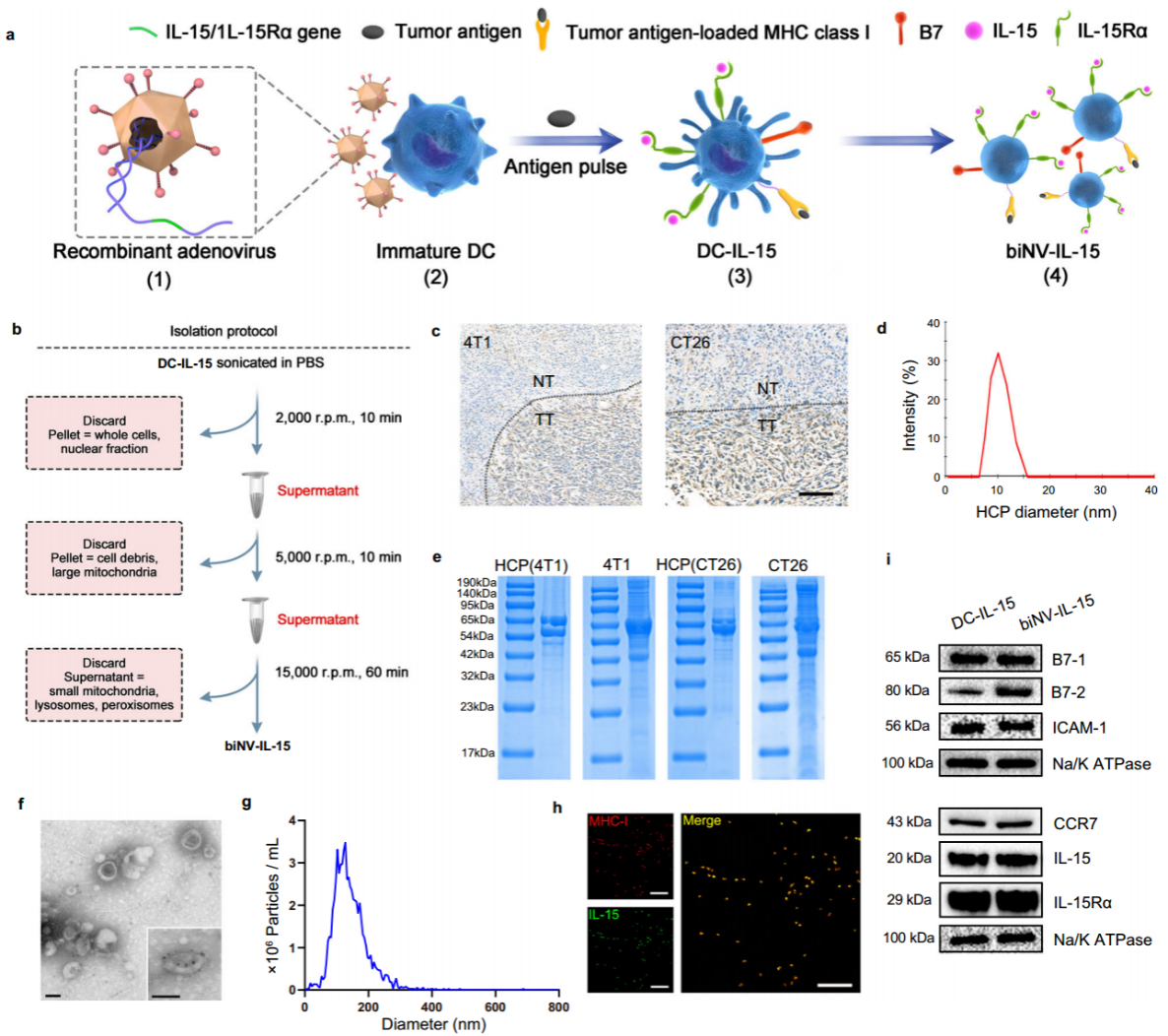 作者首先制备了用于多价IL-15自反式呈递的基因工程化biNV-IL-15。热休克蛋白70(HSP70)伴侣多肽(HCP)被选做肿瘤抗原,通过免疫沉淀技术将肿瘤组织匀浆以分离HCP。用小鼠IL-15/IL-15Rα编码的重组腺病毒载体转导BMDCs,并加入内源性HCP制备工程化DCs,通过多步密度梯度超速离心分离出biNV-IL-15(图2)。