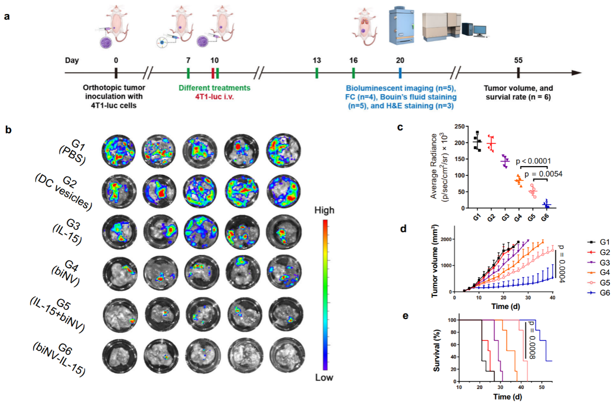 在体内抗肿瘤研究中,biNV-IL-15表现出了抗原特异性的抗肿瘤功效,在术后模型中展现出了高效的复发抑制作用(图5),并在肿瘤转移模型中有效阻断了肿瘤细胞对肺脏和肝脏的侵袭(图6)。