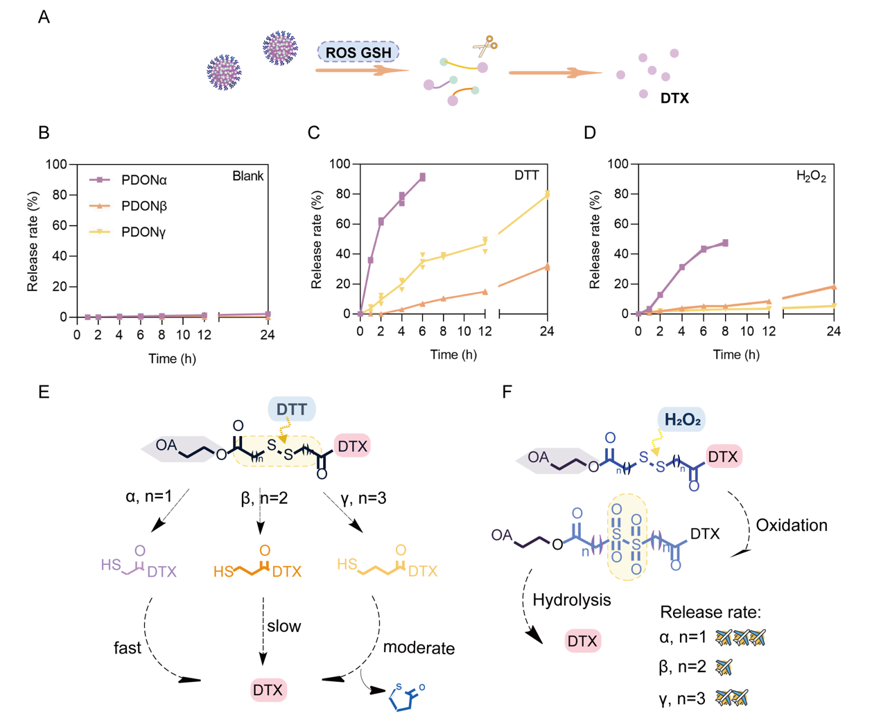 在这项研究中,作者针对化疗药物的瓶颈问题,采用前药模块化策略来改造多西他赛。选择多西他赛作为药物模块,以高生物相容性的脂肪族化合物油酸作为修饰模块,并利用三种具有位置差异化的二硫键作为响应模块构建多西他赛前药(图1)。在这三种响应模块中,二硫键分别与相邻酯键间隔1、2和3个碳原子,对应α、β和γ位置。通过简单的一步纳米沉淀法,三种前药可制备成粒径均一且高载药量的前药纳米组装体 (PDONs,s=α/β/γ)。此外,作者还从自组装机制、自组装能力、稳定性、前药转化、细胞毒性、体内分布及体内抗肿瘤效果等多个方面,综合评估了响应模块对PDONs的影响。