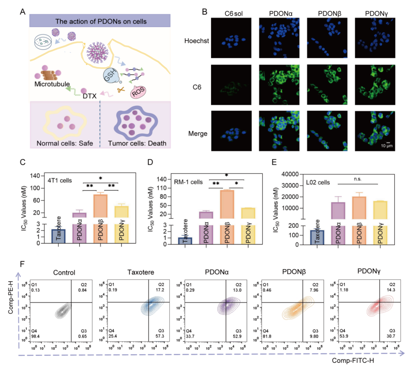 体外细胞实验结果显示(图4),随着响应模块的增长,前药在细胞内的转化效率也呈现“U”型趋势。PDONα具有最强的细胞毒性。这主要是归因于其响应模块的氧化还原高敏感性,能够在肿瘤细胞内快速、特异性地释放药物。PDONβ响应模块的敏感性不足,细胞毒性最弱。PDONγ响应模块具有适度的还原敏感性,因而表现出了中等细胞毒性。与市售制剂Taxotere®相比,PDONs对正常细胞L02的毒性很低,展现出良好的肿瘤选择性。