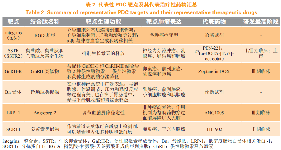 使用天然配体多肽或将其改造为稳定类似物构建的 PDC 靶点主要集中在整合素(integrins)、生长抑素受体(somatostatin receptors ,SSTRs)、促性腺激素释放受体(gonadotropin-releasing hormone receptor,GnRH-R)、铃蟾肽受体[bombesin(Bn) receptor,Bn receptor][59],也有少部分低密度脂蛋白受体相关蛋白-1(lipoprotein receptor-related protein 1,LRP-1)[60],分拣蛋白 1(sortilin-receptor 1, SORT1)相关药物正在研究[61],这些靶点对应的多肽和药物如表 2 所示。该类 PDC 有部分存在亲和谱较大的情况,如目前常用来靶向整合素αvβ3 的由精氨酸-甘氨酸-天冬氨酸组成的序列多肽(RGD)基序,在纤维蛋白原、纤维连接蛋白、凝血酶原、替纳辛和其他糖蛋白中都有存在,可以和超过 24 种整合素结合[59];目前已进入临床的靶向 SSTR2 的 PDC PEN-221,其骨架奥曲肽为 SST 类似物,对 SSTR2 的亲和力高达 16 pmol·L-1 ,但其同样对同家族的 SSTR1、SSTR3、SSTR5 也具有纳摩尔级别的亲和力(310、19.8 和 9.6 nmol · L-1 )[62],这可能是目前该类多肽选择与低毒性药物(如紫杉醇、阿霉素)或放疗药物(如 177Lu、18F、68Ga、90Y、99mTc、 111In)偶联的原因。