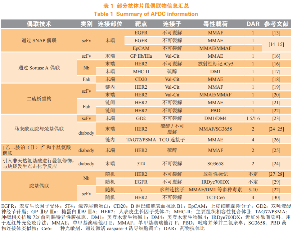 抗体片段偶联物(antibody fragment drug conjugate,AFDC),是 scFv、Nb、Fab、diabody 等通过基因工程方式改造抗体的抗体片段与毒性药物偶联构建的药物。从偶联工艺方面,AFDC 的偶联技术主要集中在以下几类:1)通过连接子上的苄基鸟嘌呤(O6-benzylguanine,BG)与末端 SNAP 标签(O6-甲基鸟嘌呤-DNA 甲基转移酶改造的蛋白)偶联;2)通过分选酶 A(sortase A),将带 NH2- GGG 的连接子与末端带 LPETG-COOH 的 AFDC 偶联,形成 LPETGGG 的结构;3)使用二硫键桥连的连接技术进行偶联,即还原抗体中的二硫键后,采用与半胱氨酸选择性反应的试剂如二硫代马来酰亚胺(dithiomaleimide,DTM)对 AFDC 的二硫键进行重新桥连的同时引入细胞毒性药物;4)利用 AFDC 末端的半胱氨酸与马来酰亚胺偶联。除此之外,也有利用非天然氨基酸引入叠氮进行偶联和使用带[ 乙二胺铂(Ⅱ)] 2+连接子与末端二硫键反应的相关报道。除抗体片段上赖氨酸与胺基进行随机偶联的非定点偶联技术外,AFDC 的定点偶联部位大多集中在抗体 C 末端,目前 AFDC 涵盖有放疗药物、光疗法药物和小分子毒素偶联物,多种连接子均有报道,部分药物汇总可见表 1。