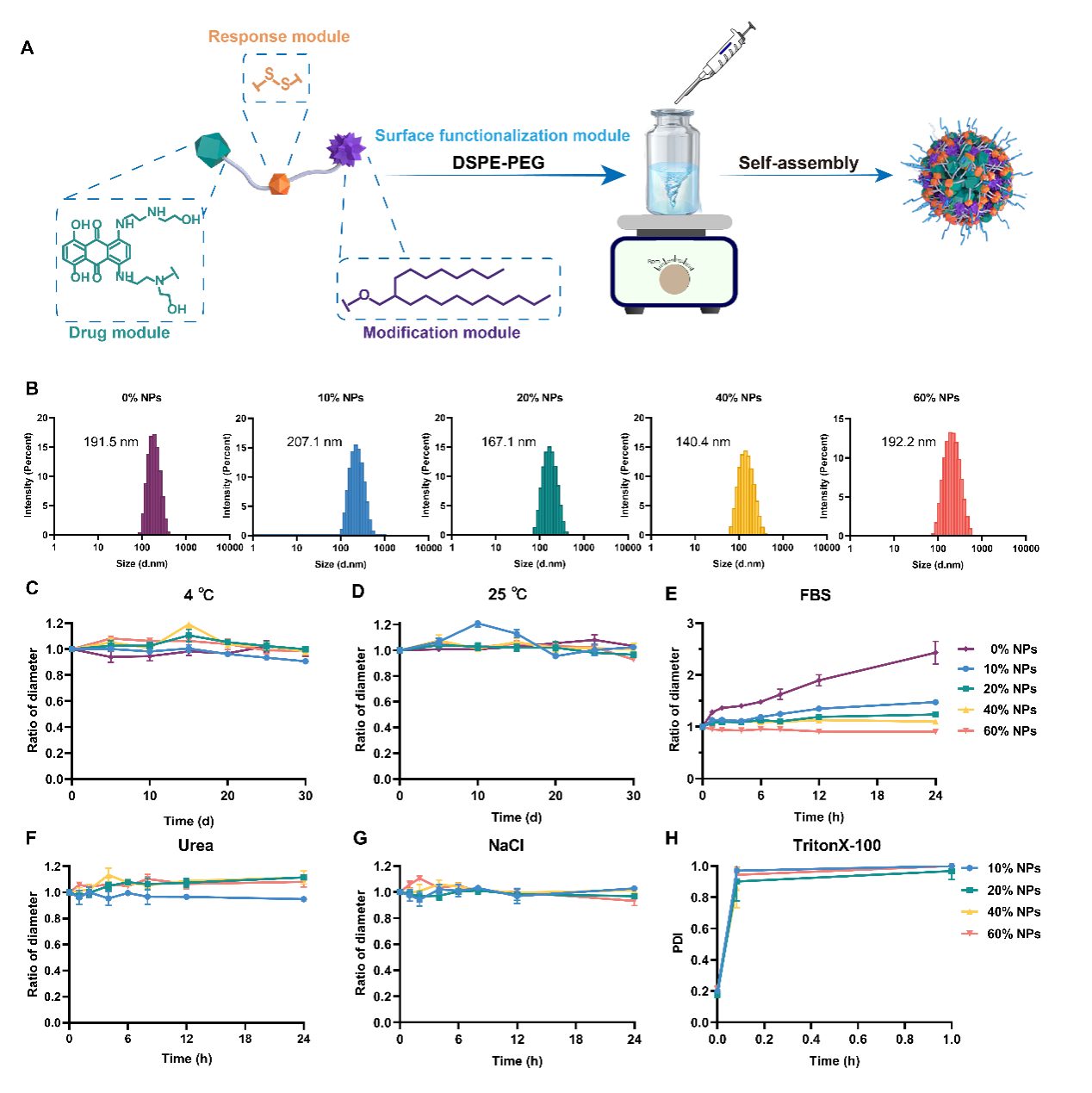 在这项研究中,作者利用前药自组装纳米粒的模块化设计原理,选择米托蒽醌为药物模块,二硫键为响应模块,辛基十二醇为修饰模块,合成了米托蒽醌前药。为探究表面功能化模块对纳米粒的关键作用,通过一步纳米沉淀法制备了5种不同比例DSPE-PEG2K(0%,10%, 20%, 40%, 60%,W/W)修饰的前药自组装纳米粒,即0% NPs, 10% NPs, 20% NPs, 40% NPs和60% NPs(图1)。作者通过探究制剂的基本表征、细胞毒性、药物动力学、药效学等性质,阐述了表面功能化模块对纳米粒的影响。