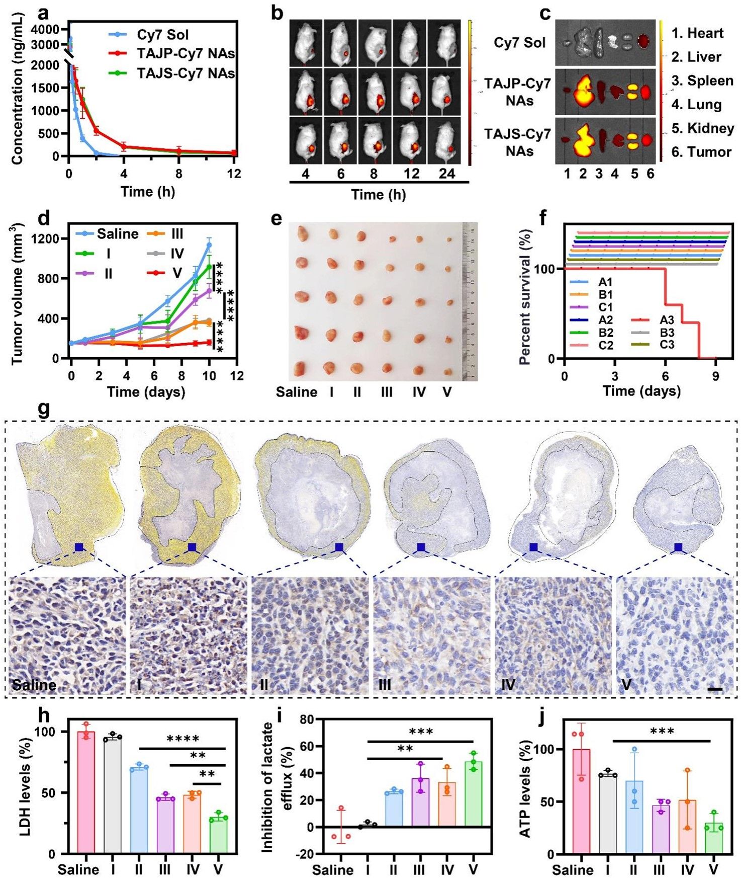 随后,作者在4T1肿瘤荷瘤小鼠模型中考察了协同抗肿瘤活性(图5)。结果表明,TPP-AA溶液剂和JQ1溶液剂对肿瘤生长抑制作用有限,这可能与体内消除快、肿瘤蓄积少、单药治疗部分能量阻滞有关。TPP-AA与JQ1(TAJ Sol)的混合溶液比TPP-AA Sol或JQ1 Sol具有更强的抗肿瘤活性,表明两者具有协同作用。TAJS NAs在整个治疗方案中具有最有效的抑制肿瘤生长的能力。最后,对其抗肿瘤作用的体内机制进行了评估,检测不同处理后肿瘤组织中c-Myc、乳酸、LDH、ATP水平。结果表明,TAJS NAs组c-Myc、LDH、乳酸外排和ATP生成显著降低,与体外实验数据一致(图4)。这些结果进一步证实了TPP-AA和JQ1的组合通过糖酵解/线粒体双重阻断实现了能量耗竭驱动的闭环肿瘤根除。