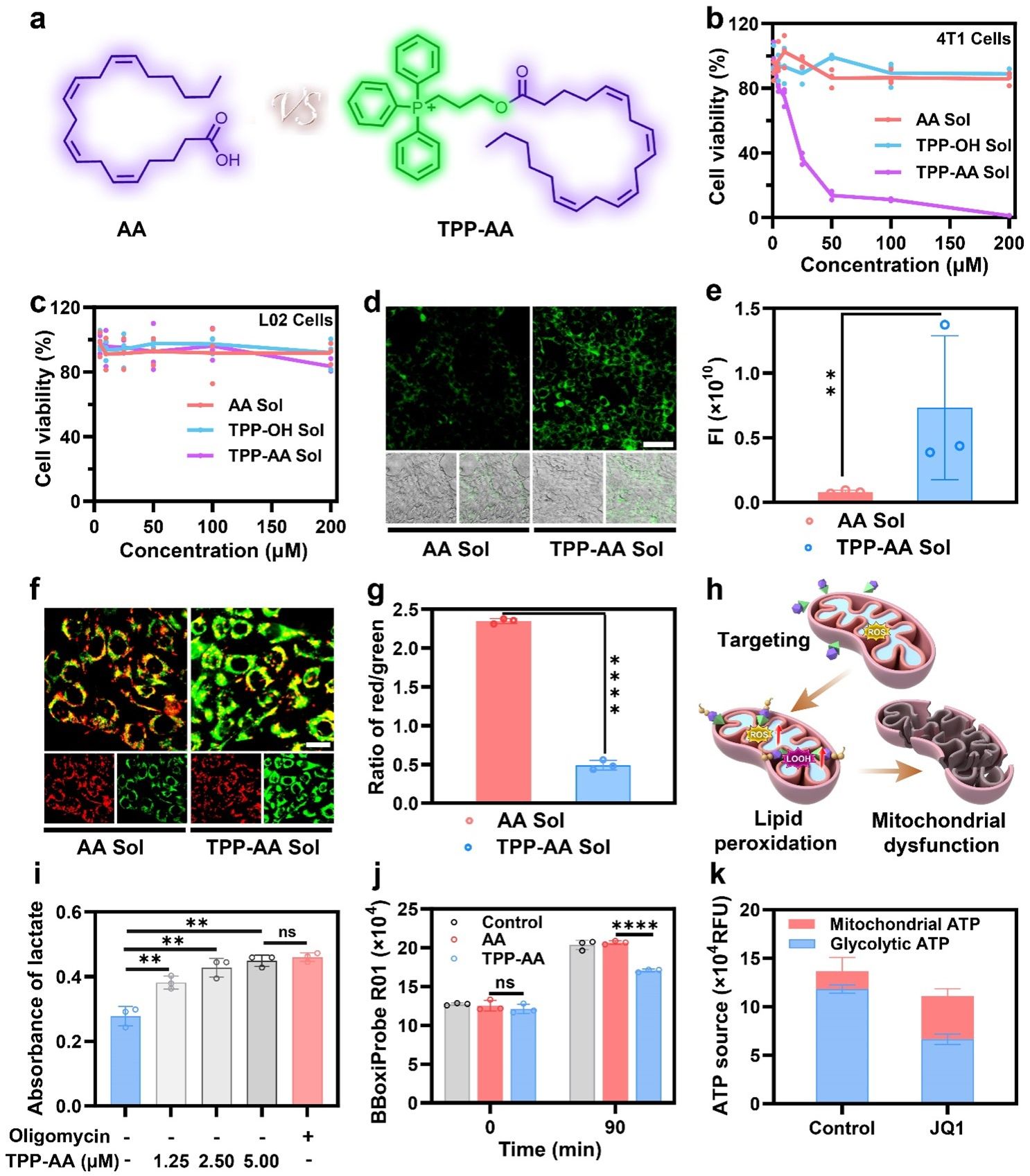 首先,作者设计并合成了一种新的线粒体氧化磷酸化抑制剂(TPP-AA),并研究了TPP-AA对肿瘤细胞和正常细胞的细胞毒性(图2)。结果表明,与AA相比,TPP-AA不仅对肿瘤细胞的细胞毒性提高了50倍以上,而且在药理学上可达到的浓度下,对正常细胞的细胞毒性可以忽略不计,显示出出色的治疗选择性。此外,作者研究了TPP-AA和AA对4T1细胞的线粒体影响。采用MitoPeDPP测定线粒体脂质过氧化程度,结果表明,与AA处理后的细胞相比,TPP-AA处理的4T1细胞显示出更强的绿色荧光,这表明TPP-AA引起了显著的线粒体脂质过氧化。此外,利用含JC-1的线粒体膜电位测定试剂盒,研究了经AA或TPP-AA处理的4T1细胞线粒体膜电位的变化。升高的线粒体膜电位诱导JC-1在线粒体基质内的积累,发出红色荧光。相反,JC-1在线粒体膜电位低的情况下保持单体状态,产生绿色荧光。与AA处理的细胞相比,TPP-AA处理的4T1细胞荧光发生了从红色到绿色的明显改变,这进一步表明TPP-AA能有效靶向线粒体,诱导线粒体功能性障碍。综上所述,这些结果共同说明,TPP-AA通过TPP驱动的线粒体靶向效应和外源补充多不饱和脂肪酸AA有效地引发线粒体功能性障碍,且AA在线粒体中容易被氧化成LPOs。