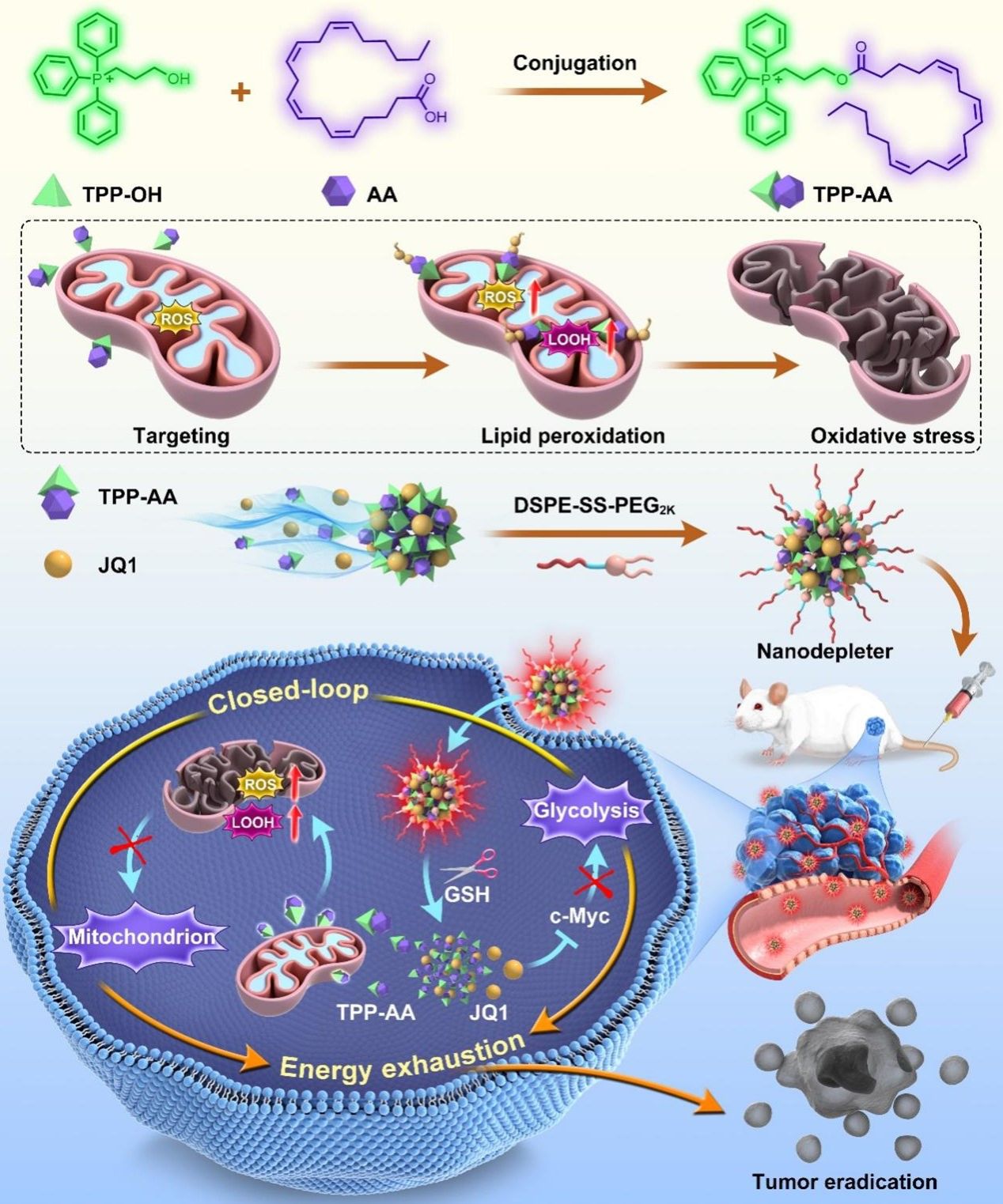 在这项研究中,作者提出了一种糖酵解/线粒体双向闭环能量耗竭策略。首次设计并合成了一种由三苯基膦(TPP)和内源性无细胞毒性的花生四烯酸(AA)组成的功能偶联物(TPP-AA),其在线粒体的高活性氧(ROS)水平过氧化AA后引发肿瘤线粒体特异性氧化损伤。值得注意的是,与AA相比,TPP-AA不仅对肿瘤细胞的细胞毒性提高了50倍以上,而且在药理学上可达到的浓度下,对正常细胞的细胞毒性可以忽略不计。TPP-AA的细胞毒性选择性应归因于正常细胞和肿瘤细胞之间线粒体膜电位的巨大差异,使其成为一种具有良好安全性的氧化磷酸化抑制剂。更重要的是,TPP-AA表现出与JQ1(一种糖酵解抑制剂)以不同的摩尔比自发共组装成无载体纳米药物的倾向。此外,将TPP-AA制备成纳米耗竭器可以避免TPP的阳离子毒性。经过优化和氧化还原响应的DSPE-SS-PEG2K修饰,以1:3的最佳摩尔比(TPP-AA/JQ1)制备了无载体的双向纳米耗竭器。在肿瘤细胞高谷胱甘肽(GSH)水平下,释放出TPP-AA和JQ1。随后,TPP-AA通过引发线粒体功能障碍阻断线粒体氧化磷酸化。同时,JQ1通过下调肿瘤细胞中c-Myc抑制糖酵解途径。最后,纳米耗竭器通过肿瘤特异性糖酵解/线粒体双向能量消耗,在多种荷瘤小鼠模型中显著抑制肿瘤生长。