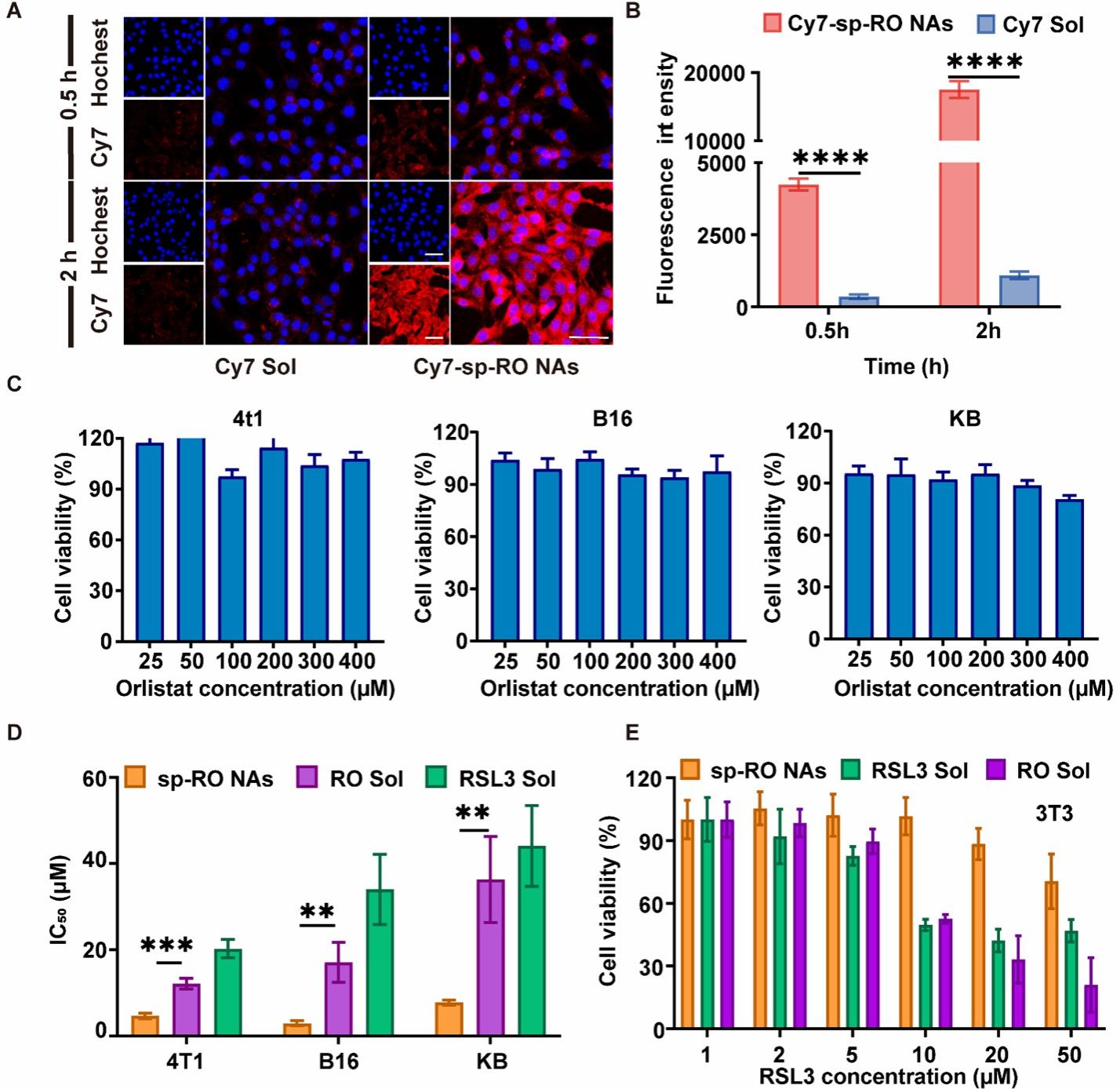 接下来,考察了Cy7标记的脂质纳米调节器在4T1乳腺癌细胞中的摄取行为。实验结果表明,脂质纳米调节器的形成提高了细胞摄取效率并具有时间依赖性。并且,sp-RO NAs在多种细胞模型中均表现出最强的细胞毒性。为了进一步评估制剂的安全性,采用了小鼠成纤维细胞系 3T3 细胞进行细胞毒性试验,实验结果表明该制剂在抗肿瘤功效和安全性之间具有良好平衡(图3)。