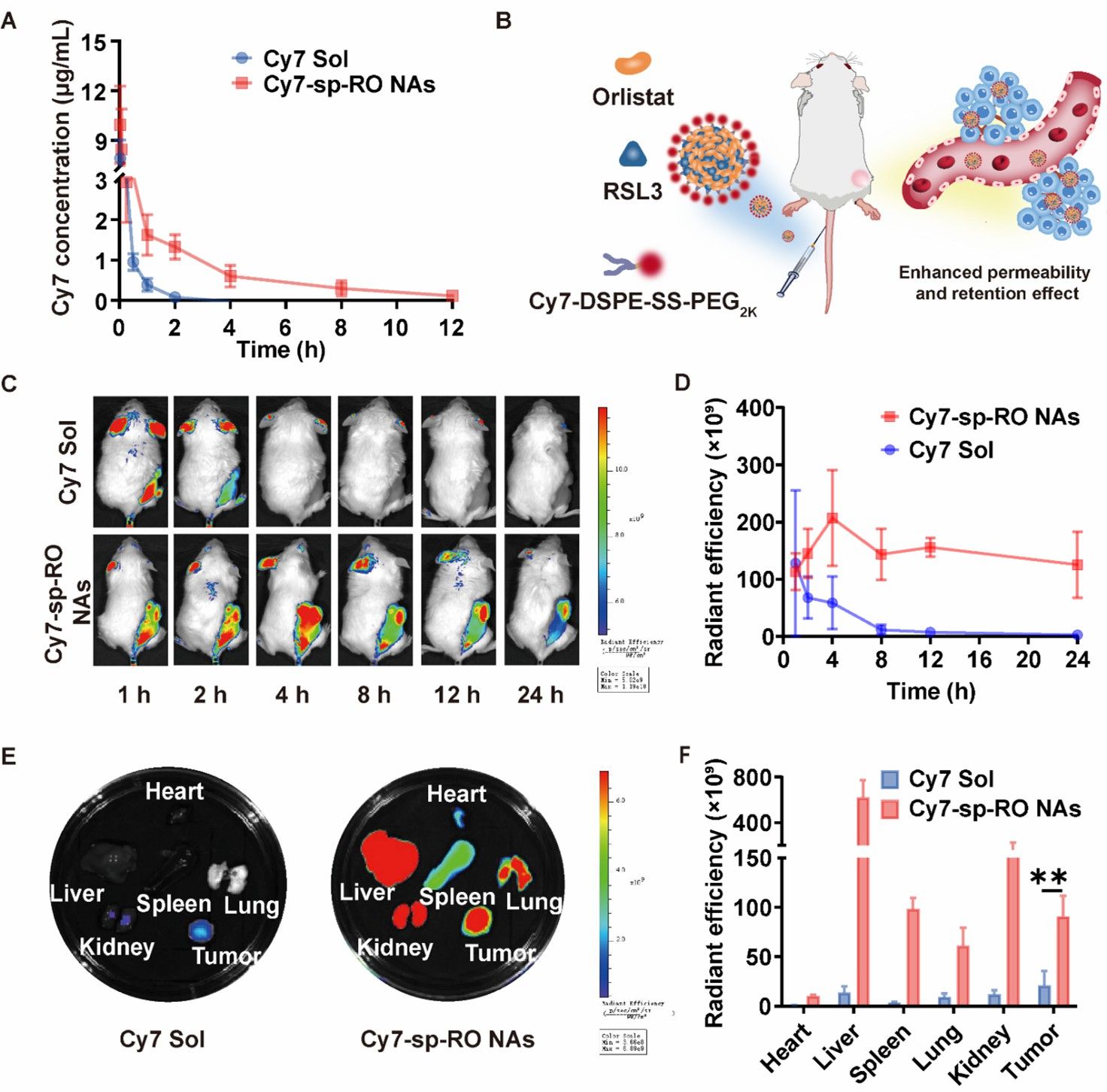 接下来,作者考察了脂质纳米调节器的体内药动学行为。结果显示,脂质纳米调节器具有显著延长的血液循环时间,这有利于其在肿瘤部位的高效蓄积。随后,作者建立了4T1荷瘤小鼠模型,通过体内分布实验探究了脂质纳米调节器在小鼠体内的分布情况。结果表明,在相同条件下,Cy7-sp-RO NAs在肿瘤中显示的荧光信号比Cy7 Sol显著提高。离体荧光成像结果表明, Cy7-sp-RO NAs在注射后4 h的肿瘤积累效率均高于注射后1h的Cy7 Sol。这些结果表明,脂质纳米调节器可显著改善其药代动力学和肿瘤蓄积,从而提高抗肿瘤效果(图5)。