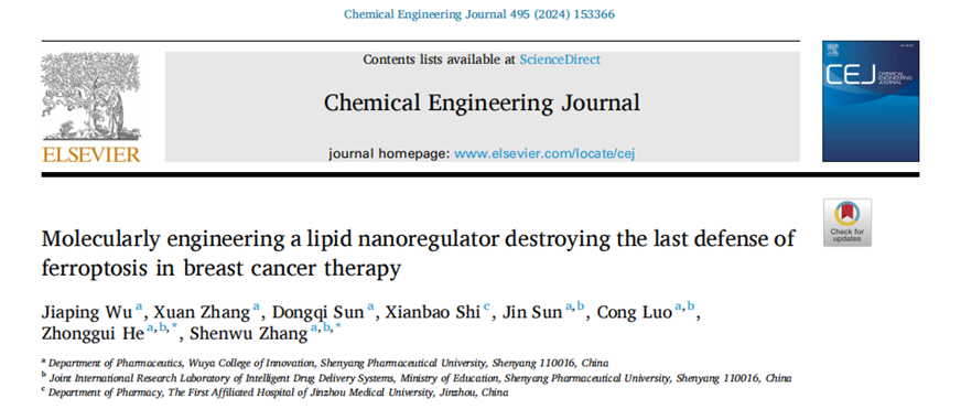 近日,beat365在线体育官网登录入口何仲贵教授/张申武教授在Chemical Engineering Journal杂志(IF = 13.3)在线发表题为“Molecularly engineering a lipid nanoregulator destroying the last defense of ferroptosis in breast cancer therapy”的研究性论文,报道了一种通过调节膜脂饱和度放大铁死亡驱动的抗肿瘤纳米药物递送策略。