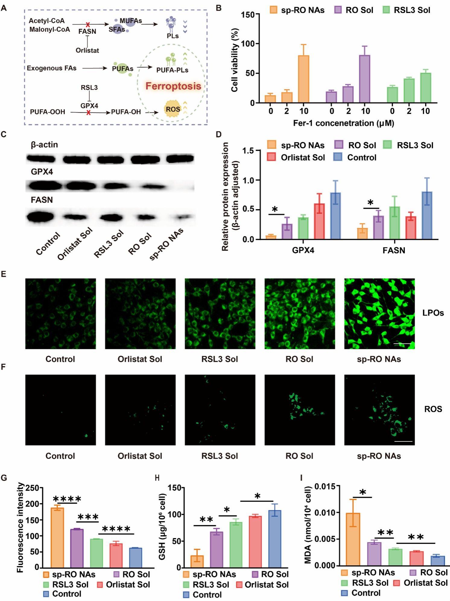 随后,作者通过使用铁死亡抑制剂Fer-1来证明铁死亡的发生。通过western blot实验验证了sp-RO NAs对GPX4和FASN表达的抑制,表明RSL3可以通过抑制GPX4破坏细胞内氧化还原稳态,导致细胞内ROS的积累,最终引发铁死亡。同时,Orlistat可以通过抑制FASN提高脂膜不饱和程度,从而提高细胞对ROS的敏感性。之后,作者检测了4T1细胞内氧化还原的水平,评估不同制剂诱导铁死亡的能力。结果显示经sp-RO NAs处理后的4T1细胞,胞内ROS、LPOs和MDA水平显著增高。这些结果证明,Orlistat确实能增强4T1细胞对RSL3诱导的铁死亡的敏感性(图4)。