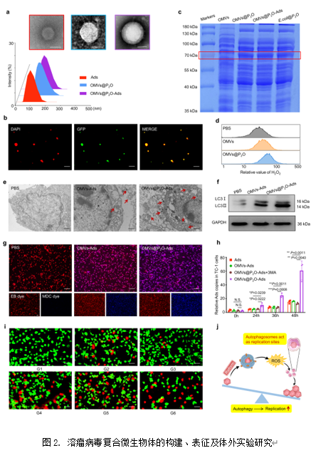 在这项研究中,作者首先利用过膜挤压技术制备了工程化溶瘤病毒复合微生物体,考察了复合微生物体的粒径和外貌(图2a)并借助荧光共定位技术确证了复合微生物体的构建(图2b)。随后,考察了复合微生物体中吡喃糖氧化酶的存在(图2c)及体外ROS的产生(图2d)。接着,考察了复合微生物体诱发肿瘤细胞自噬的能力(图2e-g),并证明了宿主细胞的过度自噬促进了溶瘤病毒的复制(图2h)。最后,作者考察了复合微生物体的体外细胞毒性(图2i)。