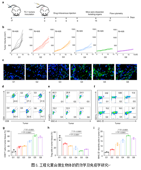 作者构建了TC-1异位瘤肿瘤模型,考察了静脉注射工程化复合微生物体后抑制肿瘤组织生长的能力。结果显示,相较于静脉注射裸Ads及未生物矿化的复合微生物体,工程化复合微生物体具有最强的抑制肿瘤生长的能力(图5a-b)。随后,作者通过免疫荧光技术及流式细胞术考察了工程化复合微生物体激活抗肿瘤免疫的能力。结果显示,工程化复合微生物体能最有效地促进肿瘤处树突状细胞及CD8+ T细胞的浸润,并重塑了肿瘤处抑制性免疫微环境(图5c-i)。