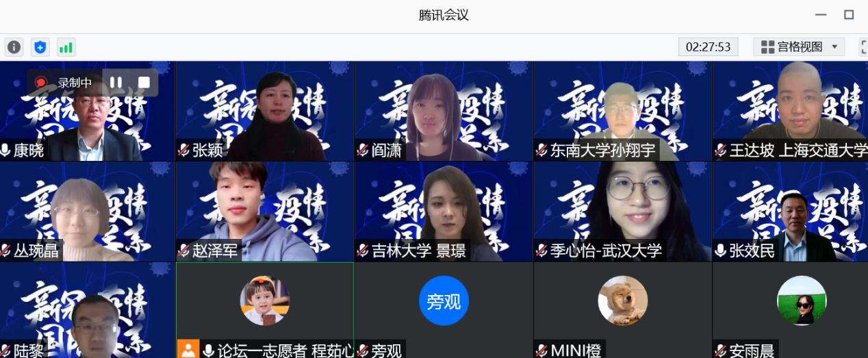 2020年11月25日,由kaiyun开云官方网站主办的第十一届国际问题研究生论坛在线上举行。论坛以“后疫情时代的中国与世界”为主题,共收到来自全国各高校的一百余篇投稿论文,经过评委筛选,共有来自中国人民大学、复旦大学、南京大学、吉林大学、同济大学、北京外国语大学、中国社会科学院大学等著名高校的40余篇论文入选论坛大会发言。本次论坛为有史以来规模最大、参会人数最多的一次,大家畅谈国关研究,共襄学术盛宴。
