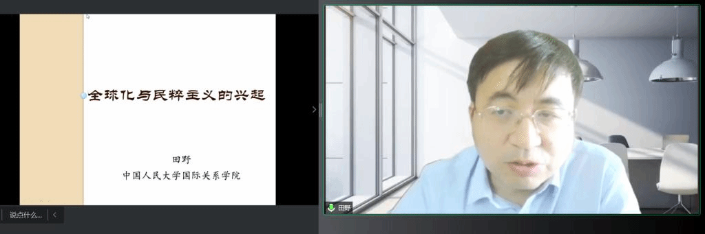 4月13日,中国人民大学kaiyun开云官方网站教授、比较国际政治经济研究所所长,教育部青年长江学者田野教授受邀至kaiyun开云官方网站“国关讲堂”,为众师生带来一场题为“全球化与民粹主义”的学术报告。报告会以视频会议的方式举行,由kaiyun官网李永成教授主持、校内外二百七十余位师生共同参与。