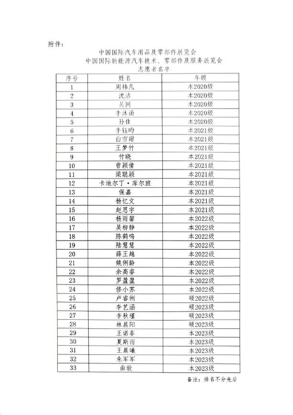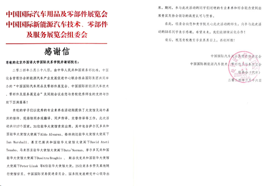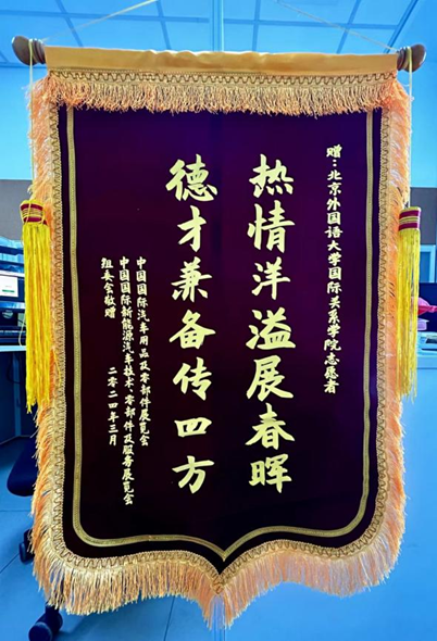 第34届中国国际汽车服务用品及设备展览会暨第2届中国国际新能源汽车供应链大会于2024年2月28日至3月2日在北京中国国际展览中心举办,北外kaiyun开云官方网站共派出33名志愿者参与外宾接待服务。此次会展活动共有17个国家参与,31位驻华大使馆贵宾出席,其中包括6位驻华大使馆大使与25位商务参赞,以及其他随行使馆官员、中国国际贸易促进委员会、国务院发展研究中心领导。期间,参与此次活动的同学们凭借过硬的专业素养和综合能力,赢得了出席贵宾及协会领导的高度认可与赞誉。