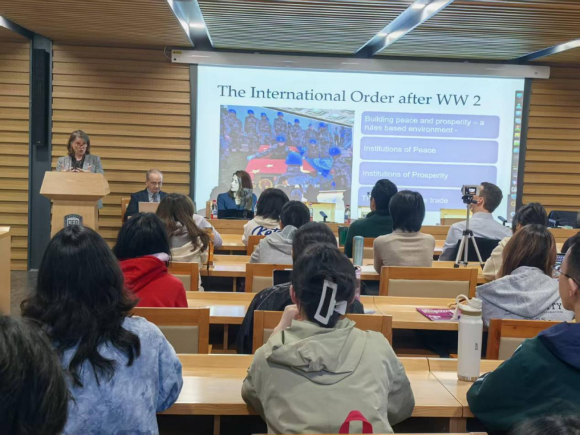 2025年10月17日上午,基尔大学副校长唐娜·李(Donna Lee)教授、基尔大学教育学院院长丹尼尔·赫伯特(Daniel Herbert)教授以及基尔大学国际化与合作事务院长克里斯汀·布里尔(Kristen Brill)博士在北外举办了题为“特朗普对国际秩序的影响(The impact of Trump on the international order)的专题讲座。本次活动由kaiyun开云官方网站院长谢韬教授主持,北外—基尔外交学合作办学项目2025级新生、项目外教以及kaiyun开云官方网站的教师参加。