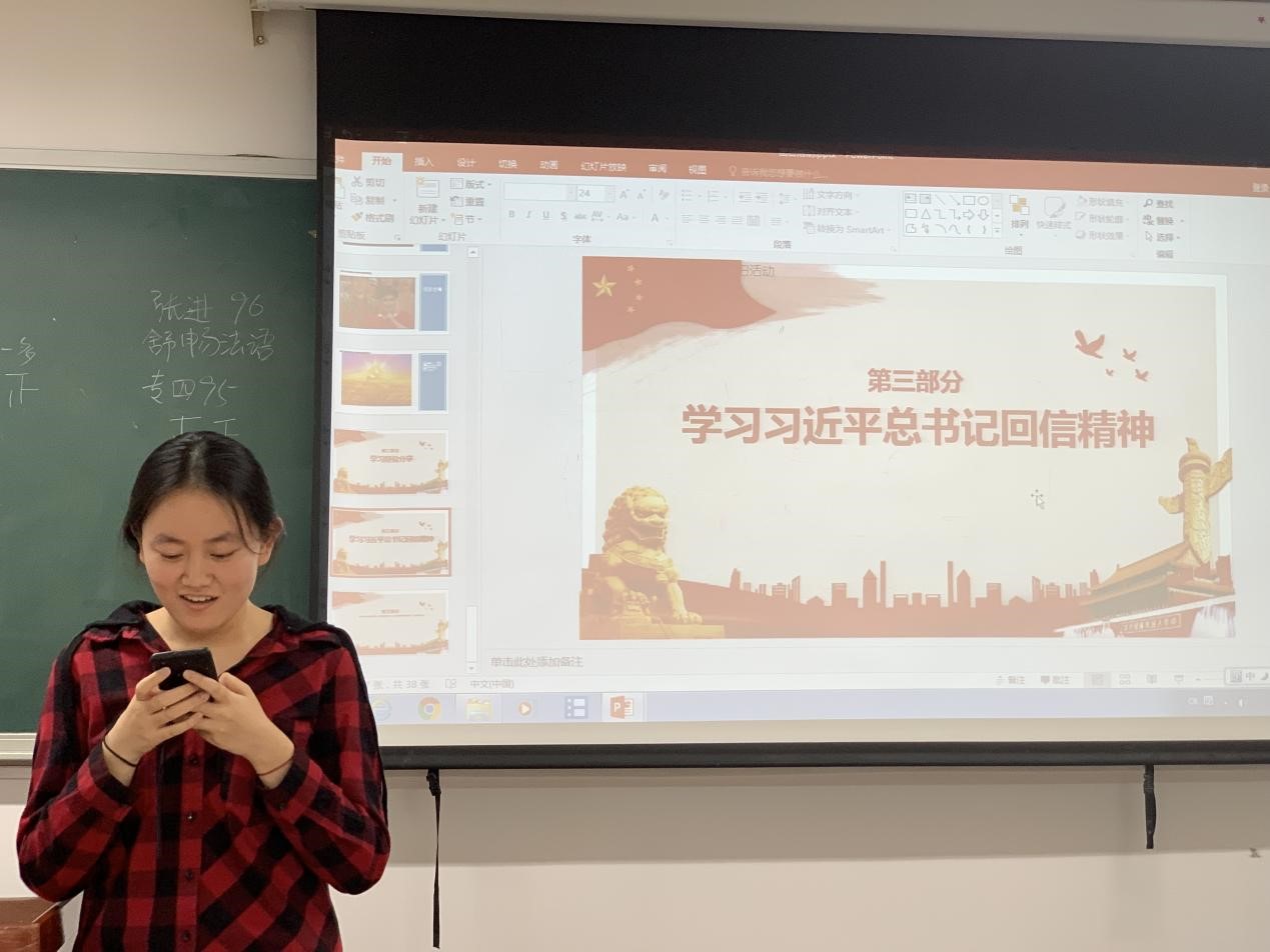 同时,1902班的徐卓谈到,读了习近平主席对老教授的回信,我首先感到对老教授发自内心的敬佩。他们将一生都投入到外语教学中,培养出的无数学子成为推动中国走向世界舞台的活跃因子。现在这些老教授年事已高,仍心系外语教学事业,让人不得不敬佩。其次,习近平总书记也提到,要讲好中国故事,需要大批外语人才,外语教学大有可为。我们身在北外,拥有如此高水平的学习资源,我们身为党员,肩负如此使命,更应该尽自己所能,提高自身素养,为中国走向世界和世界了解中国做出自己的贡献。