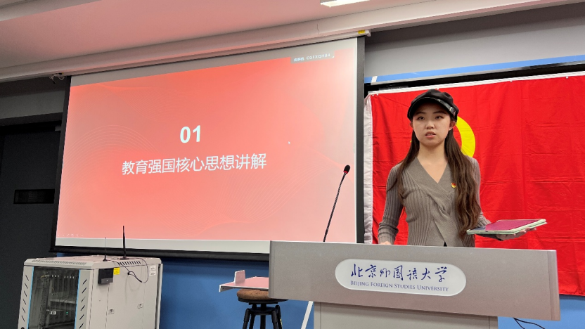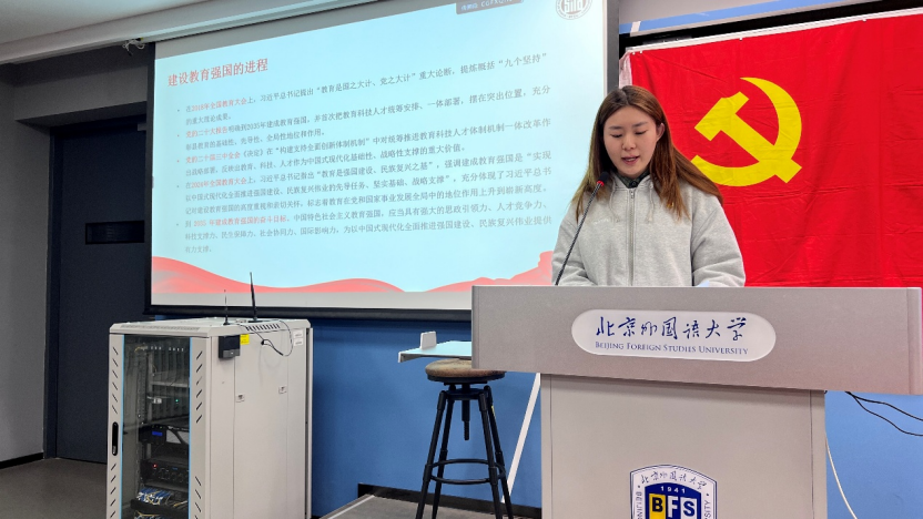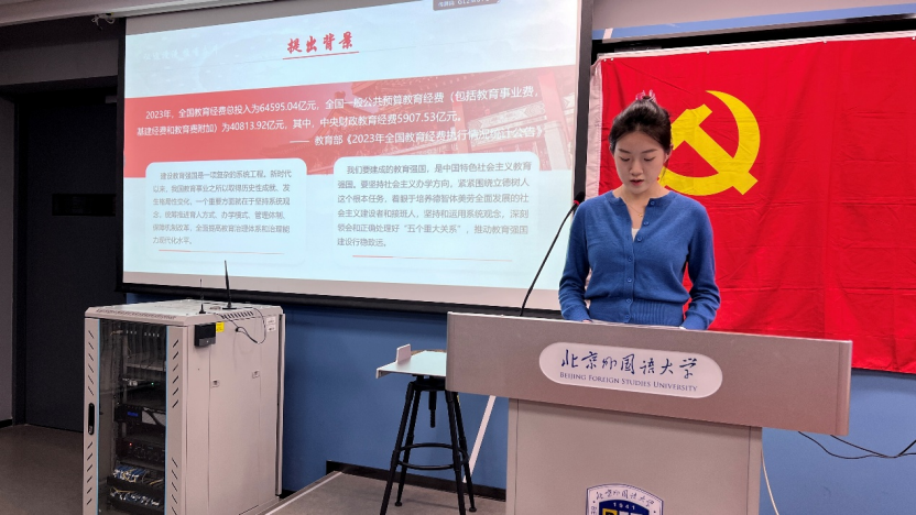 活动伊始,张方琼宇同志以教育强国思想的核心要义为主线,聚焦“坚持党的全面领导、落实立德树人、坚持以人民为中心、一体推进教育科技人才发展”四项原则,结合外交学科特点与学生视角,从“把牢政治方向、夯实德智体美劳全面培养、践行为民宗旨、拓展全球胜任力、强化科技赋能”五个维度,系统梳理了教育强国战略对外语外交人才培养的路径。她提出,要将教育强国的宏伟蓝图细化为课堂学习、科研训练、国际实践的具体行动,号召青年学生在知行合一中成长为堪当民族复兴重任的高素质外交人才。