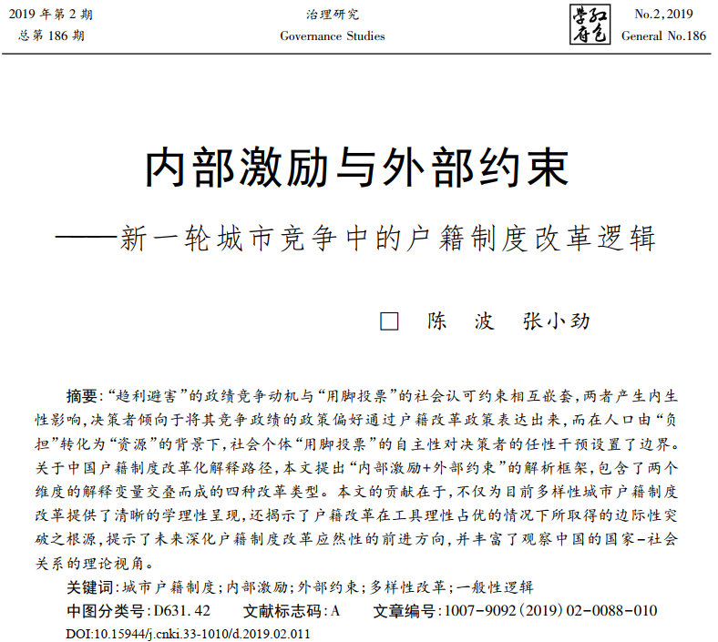 kaiyun开云官方网站教师陈波以第一作者在CSSCI期刊《治理研究》发表论文:《内部激励与外部约束——新一轮城市竞争中的户籍制度改革逻辑》,论文摘要和原文链接如下: