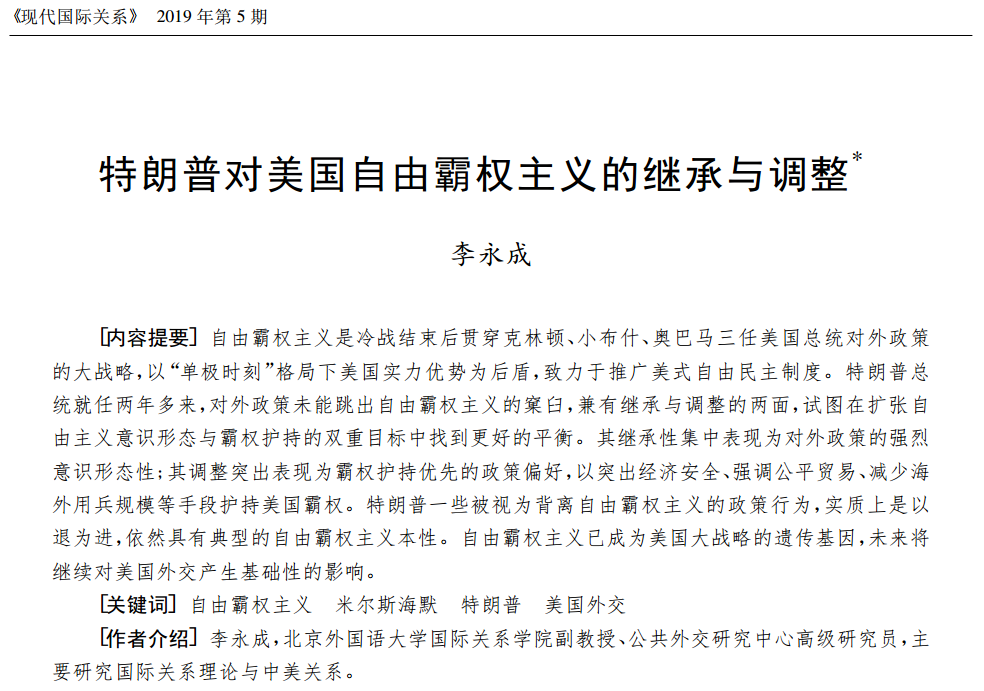 kaiyun开云官方网站李永成副教授在CSSCI期刊《现代国际关系》2019年第5期发表论文《特朗普对美国自由霸权主义的继承与调整》,论文摘要和原文链接如下: