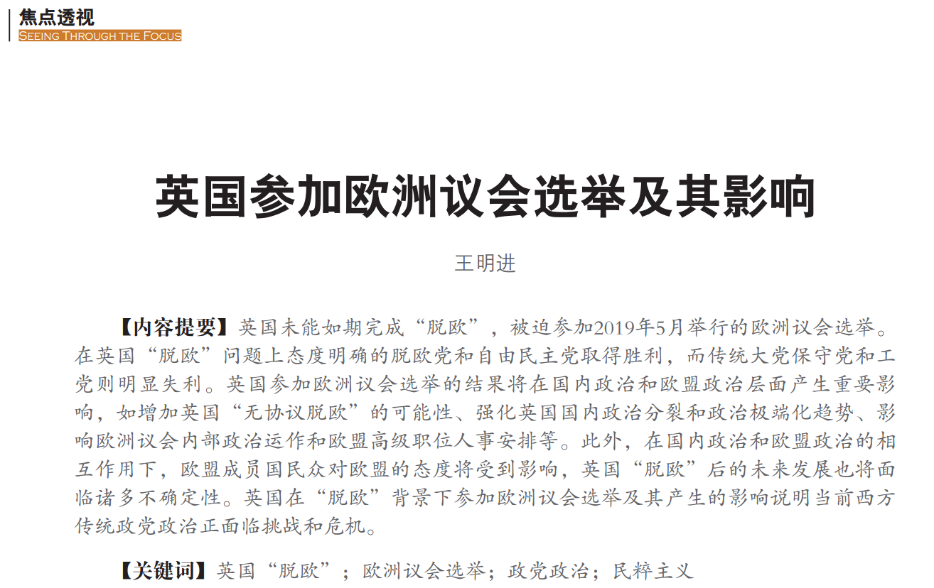 kaiyun开云官方网站副院长王明进研究员在CSSCI期刊《当代世界》2019年第7期发表论文《英国参加欧洲议会选举及其影响》,以下是论文摘要:
