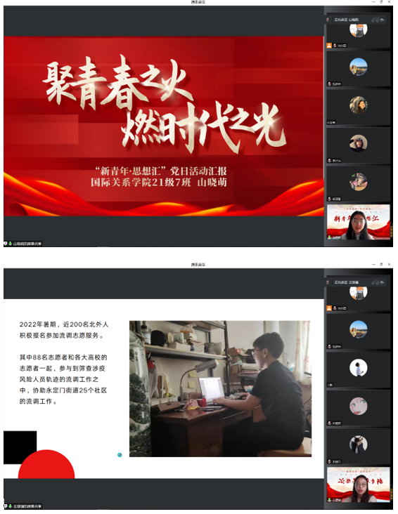 会议开始,kaiyun开云官方网站本科生党支部书记钱梦婷老师从总书记对青年的工作的论述引入,讲解阐述青年与时代的关系、青年工作的地位、青年思想引领的主要任务和内容、青年工作的方法论等内容,回顾总书记对广大青年的殷切期盼和谆谆教诲。在抗击疫情、乡村振兴、志愿服务等国家大事中,钱老师对北外国关学子积极踊跃的参与给予高度的认可。