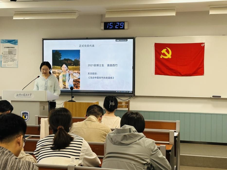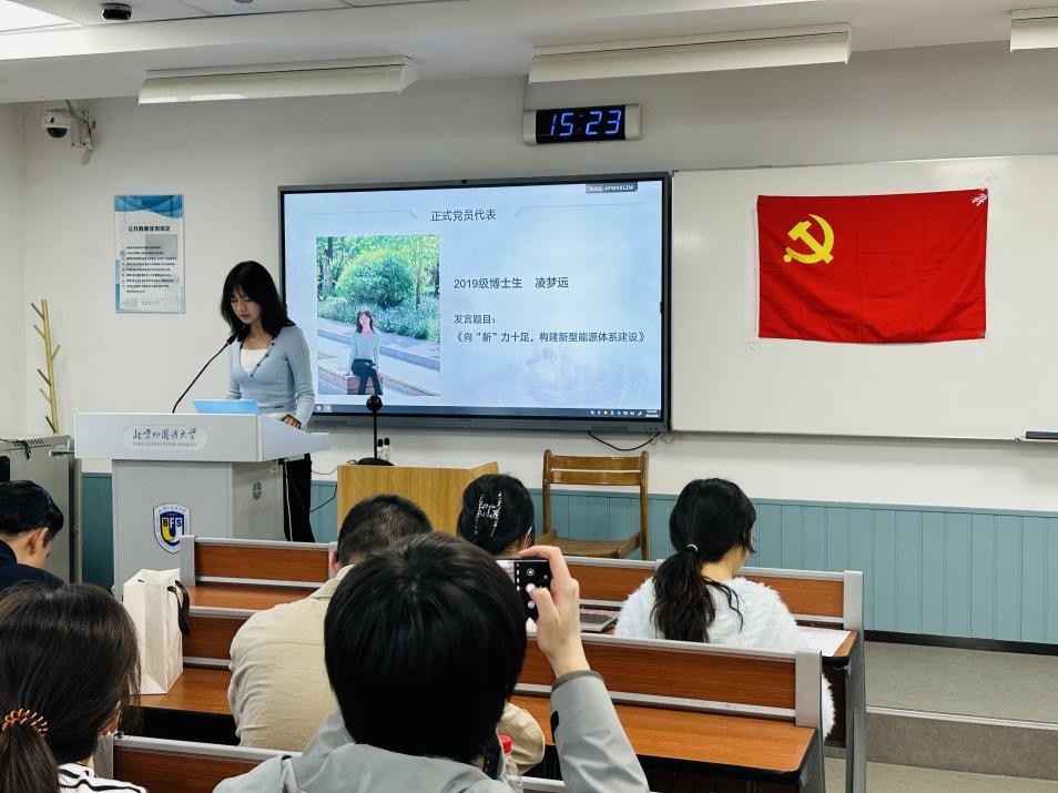 本次主题活动第一项为博士生党员主题发言。2019级博士生王天禹以解读《政府⼯作报告》吹风会为切入点,选取报告中与中国外交相关的重要内容,发表了题为《“新时代新征程”中国特色大国外交的智慧与贡献》的讲话,提出中国外交发展的重点是推动全球安全治理体系改⾰、破解国际安全困境以及推进构建⼈类命运共同体。2019级博士生凌梦远的发言题目为《向“新”力十足,构建新型能源体系建设》,提出新型能源体系是社会主义现代化强国建设的关键抓手、是国家能源安全和国家竞争力的有力保障,也是是实现“双碳”目标以及推进生态文明建设的重要支撑;2021级博士生袁田西竹浅析了当下中国青年的美国观,认为当代青年正站在新的历史起点,生逢其时、重任在肩,应自觉担负起历史使命,助力中国特色大国外交、扬帆前行。青年人承担着中华民族伟大复兴的光荣使命,需要在党和国家对外工作中发挥作用、传播中国故事的积极传播者、实践国家重大外交理念。